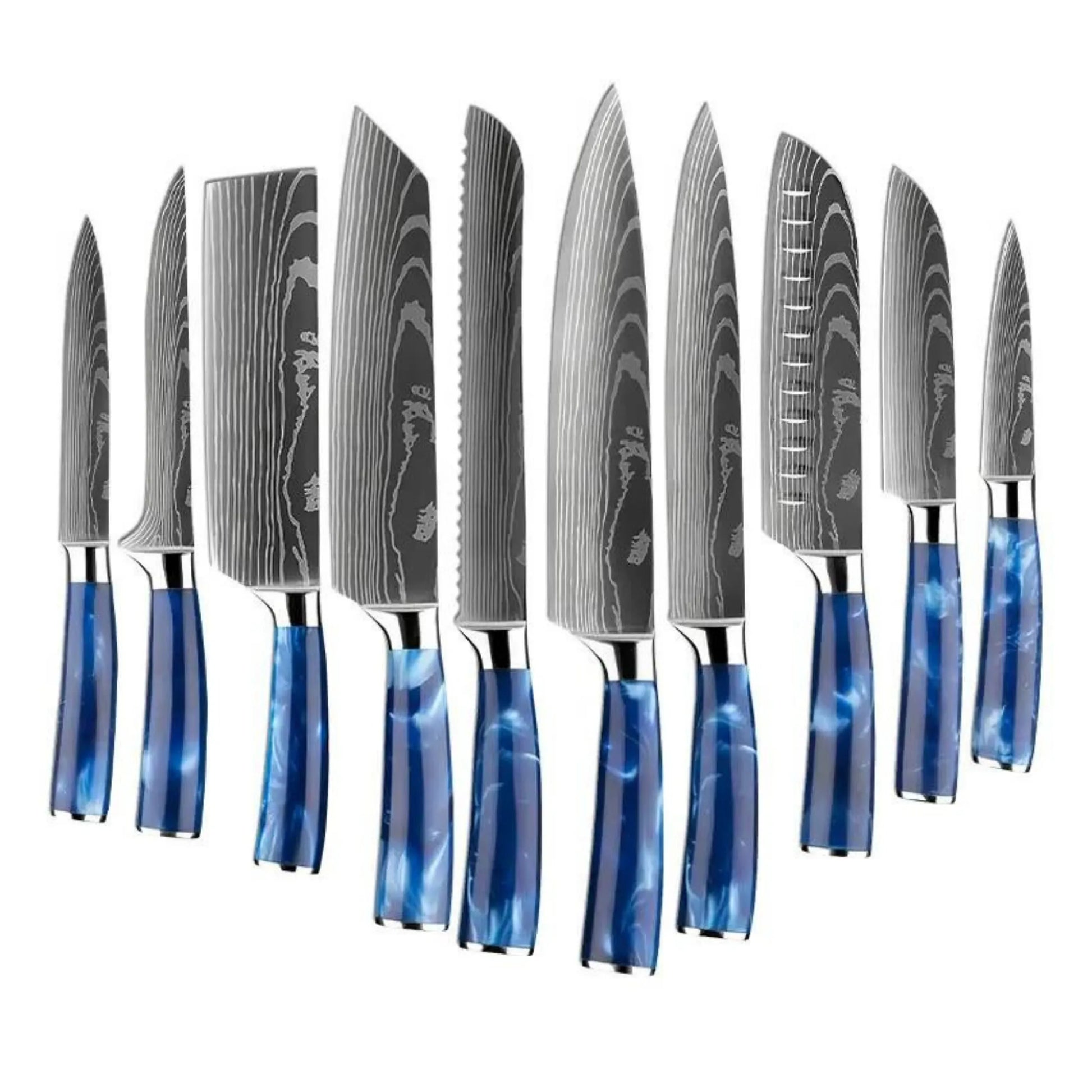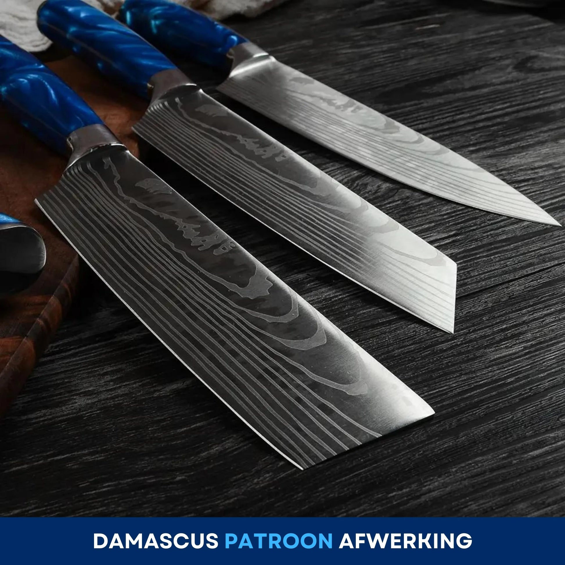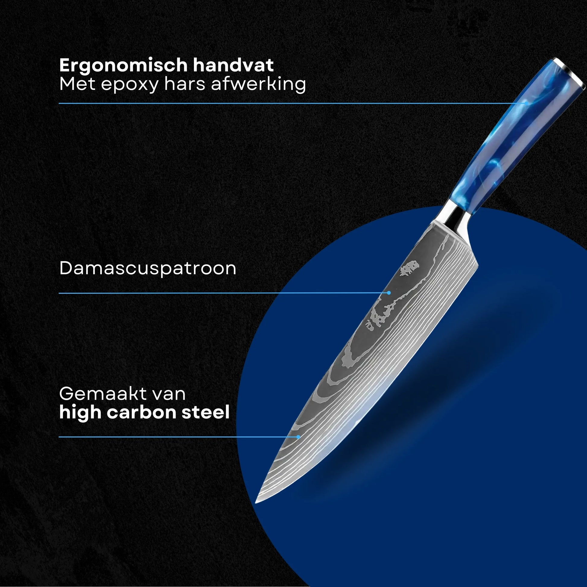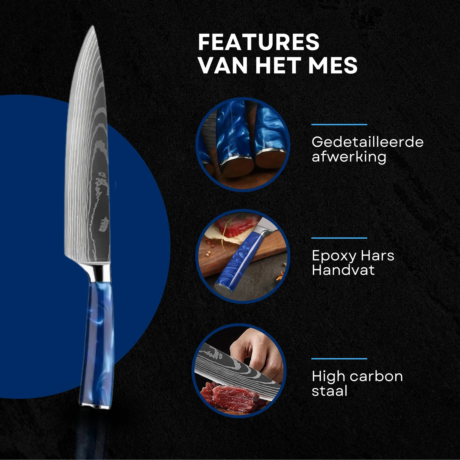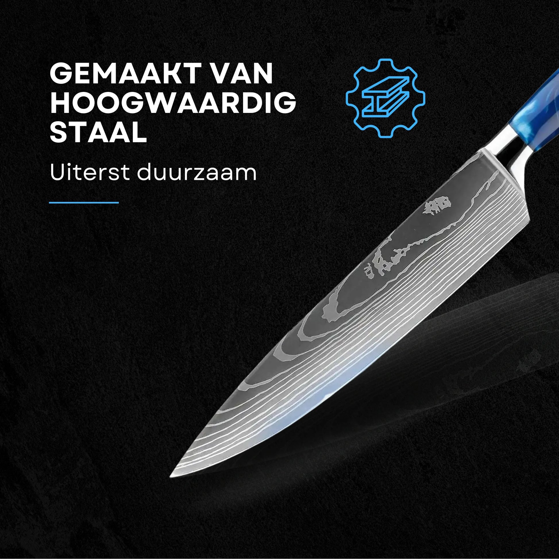 Omdat wij een set leveren met wel 9 verschillende koksmessen ben jij helemaal klaar voor alle gerechten uit alle keukens. Met de chefmes, snijmes, broodmes, hakbijl, grote en kleine santoku mes, uitbeenmes, utility mes en paring mes tover jij van elke gerecht een culinair moment. Daarnaast ontvang jij ook een vinger protectie, waardoor jij ook als beginneling gebruik kan maken van de vlijmscherpe messen.