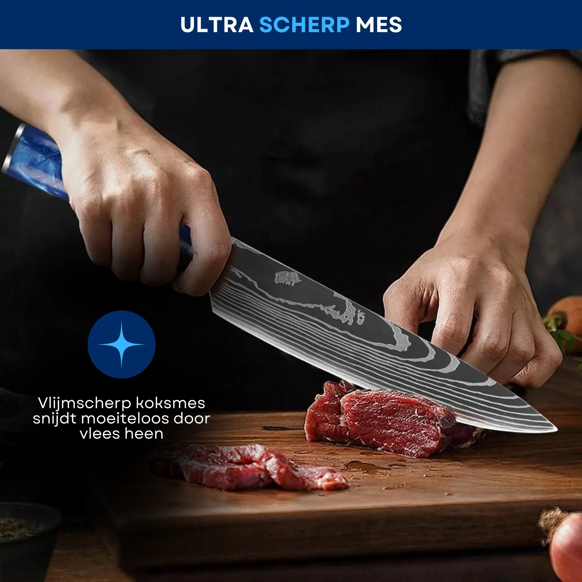 Een goed koksmes is het beste ingrediënt in de keuken. Of jij nu een keukenprinses bent of minder fanatiek bent in de keuken, een koksmes is en blijft een belangrijk mes. Veel mensen weten niet wat een goed keukenmes doet met hun kookprestaties en snelheid. Het versnelt jouw snijkunsten en verbetert precisie en fileerwerk. Ervaar jij ook dat jouw messen snel bot worden en heb jij vaak dat gesneden eten aan het mes vast blijft plakken? Dan is dat met deze vlijmscherpe messenset verleden tijd.