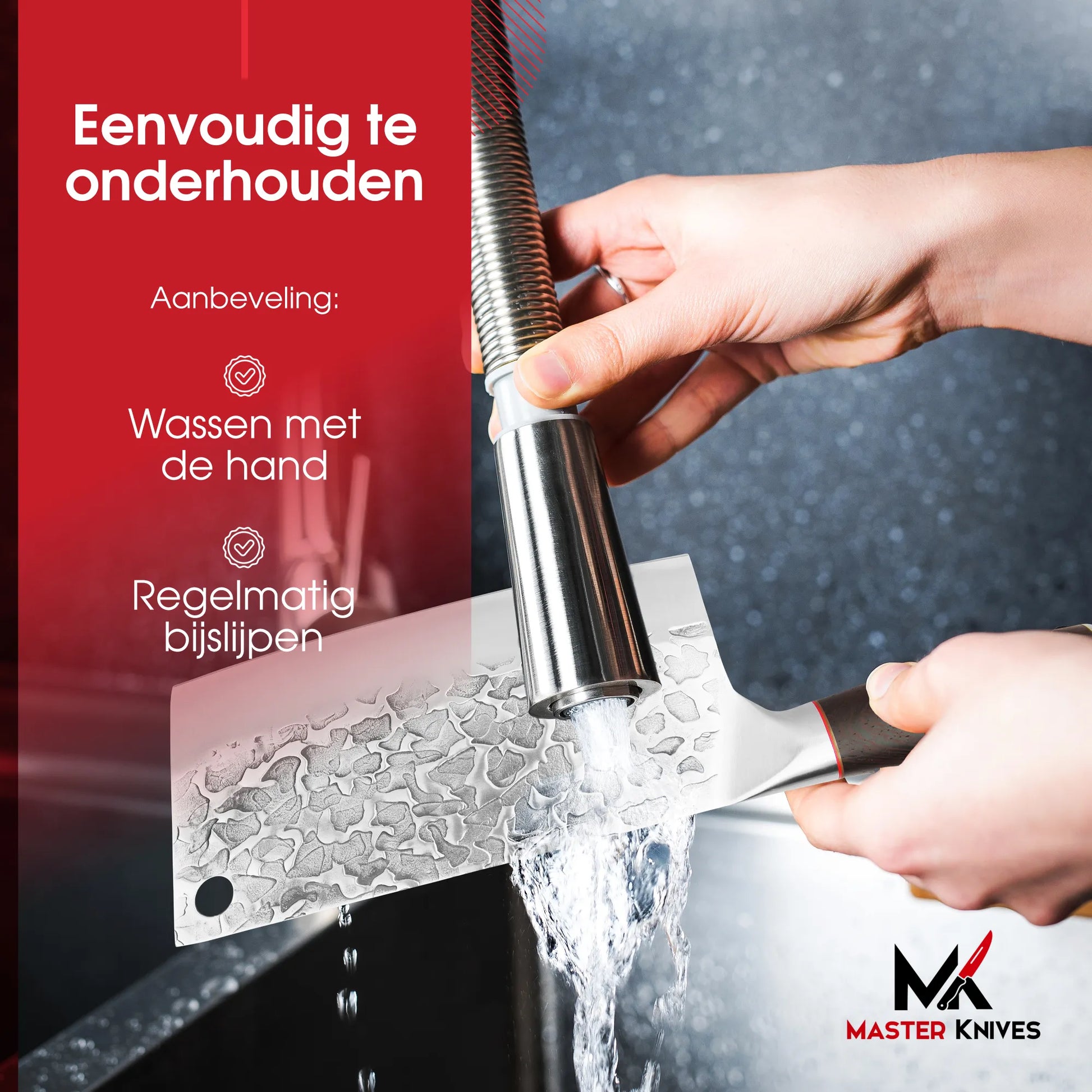 Let op, wij raden aan het hakmes met de hand schoon te maken. Doe het mes niet in de vaatwasser. Ook willen wij aanraden je nieuwe aanwinst regelmatig te slijpen.